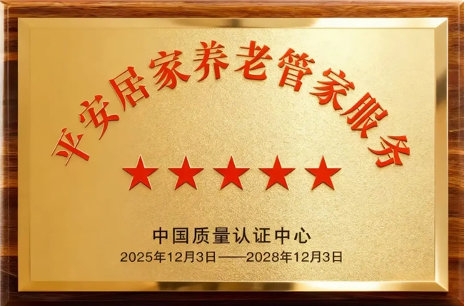 近日,中国平安旗下平安居家养老管家服务通过中国质量认证中心(CQC)权威评价,成为全国率先获得“居家养老管家服务”五星级评价的养老服务,证书编号为CQC20251129830-001,有效期至2028年12月01日。这一评价为国内居家养老行业高质量发展树立了标杆。